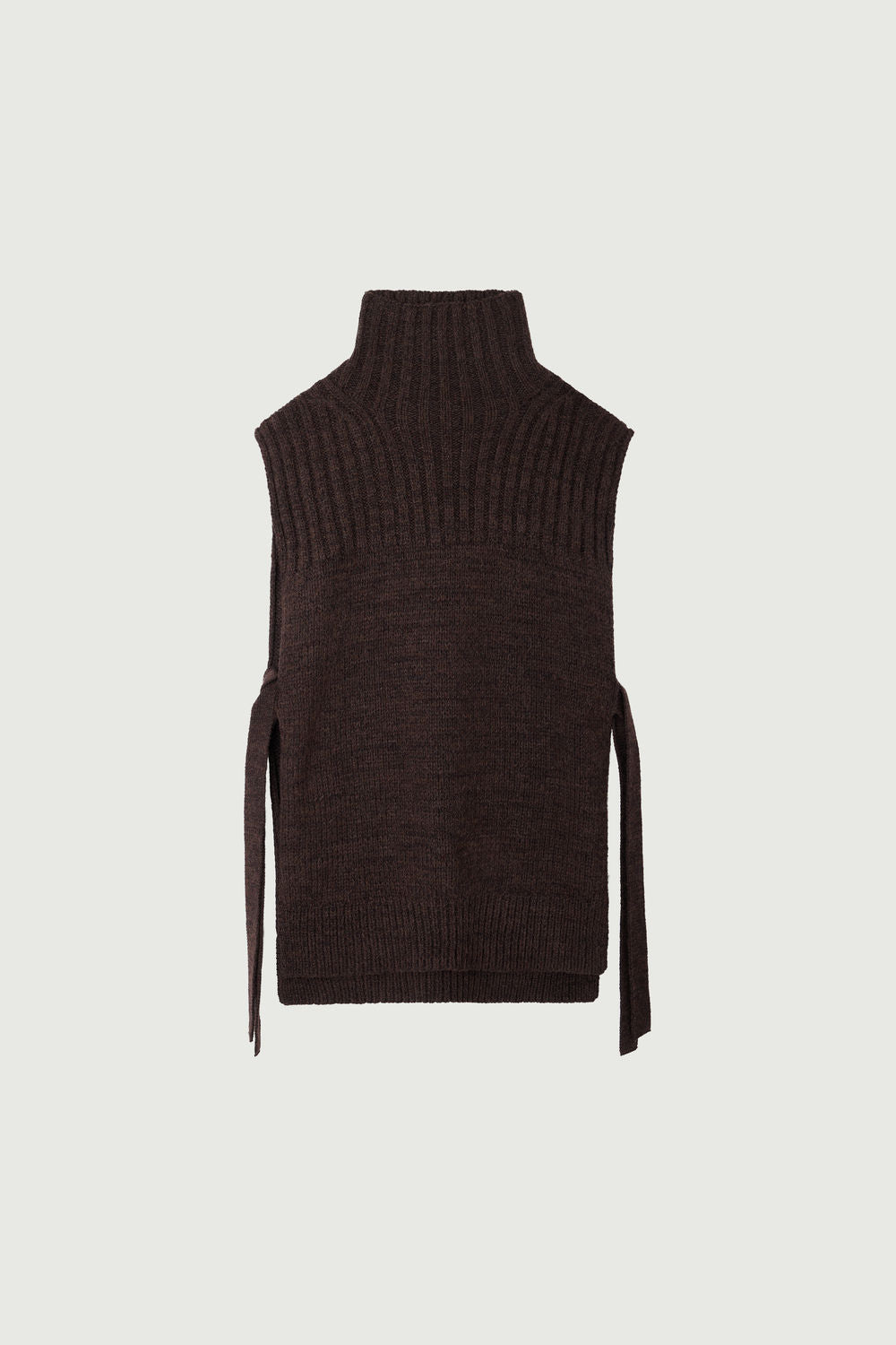 BIARRITZ is an oversized bib, knitted in virgin wool yarn. It has a visual texture created by a ribbed effect, with ties at the sides that can be worn cinched to accentuate the waist or left hanging. A perfect garment for adding warmth to an outfit, such as a silk dress or a cotton shirt dress. It stands out with a high neck to keep the neck covered.